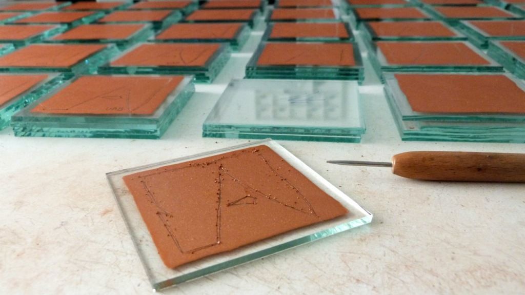 Desde el año 2010 vamos realizando este tipo de pieza en vidrio float, con inclusión de pigmentos metálicos, fundida en el horno de nuestro estudio.