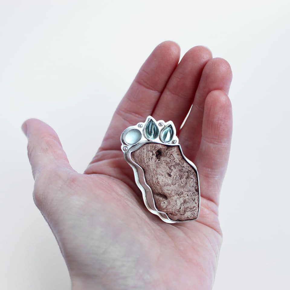Y ese trocito de corcho ha acabado formando parte de dos joyas que encajan… Un anillo y una pulsera. Para ambos es vital el mar y el bosque, y así lo he querido transmitir con esas hojitas y los mini vidrios de playa. Ha sido un reto, definitivamente, pero «Solo aquellos que arriesgan ir demasiado lejos, pueden encontrar lo lejos que pueden llegar» (T.S. Eliot)