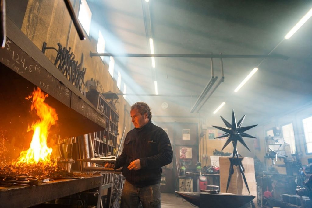Pero por si eso no fuera suficiente motivo de orgullo y emoción, la corona de 12 estrellas de hierro forjado que rodea la torre, están realizadas por otro enorme artista, Enric Pla Montferrer, con el que tengo el honor de colaborar profesionalmente en la realización de algunos premios. Él lleva años trabajando en la Sagrada Família, y sus obras de hierro forjado forman ya parte de ella.